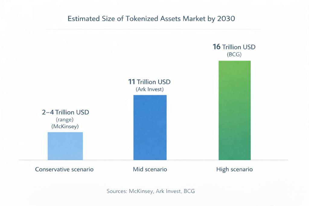 Diferentes estimaciones coinciden en que la tokenización de activos podría alcanzar varios trillones de dólares hacia 2030. Mientras escenarios conservadores proyectan alrededor de 2 a 4 trillones, estimaciones más optimistas elevan la cifra a más de 10 o incluso 16 trillones de dólares, reflejando el potencial de crecimiento de esta nueva infraestructura financiera